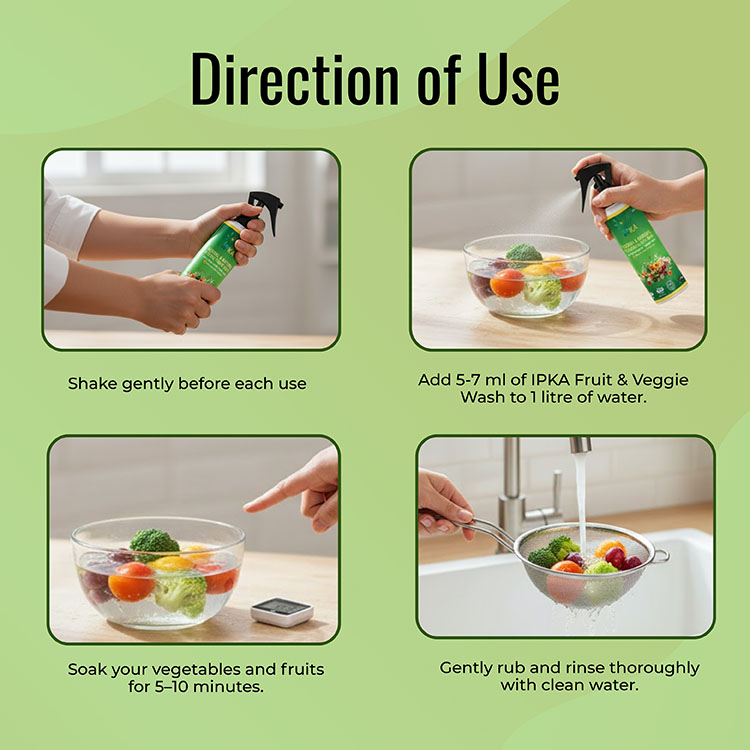 Free from harsh chemicals, bleach, and artificial additives, this vegetable and fruit wash is safe for daily household use and suitable for all types of produce including leafy greens, apples, grapes, tomatoes, root vegetables, and more. It rinses easily, leaving no residue behind and preserving the natural freshness of your food.