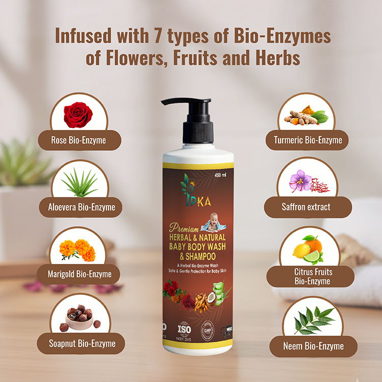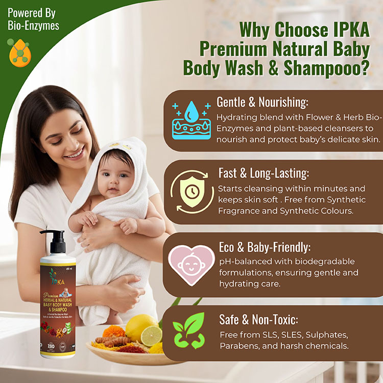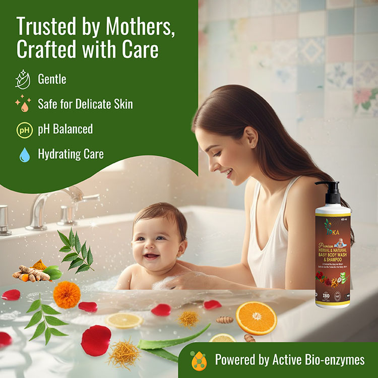 Our premium herbal and natural baby body wash and shampoo gently cleanses delicate baby skin and hair without irritation. Enriched with mild herbal extracts, it is tear-free, chemical-free, and safe for daily use. Leaves baby’s skin soft, nourished, and naturally fresh.