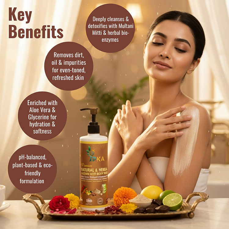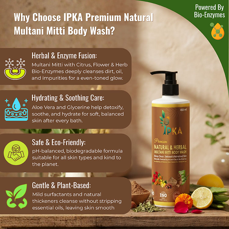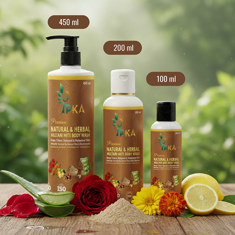 Our premium natural and herbal Multani Mitti body wash gently cleanses, detoxifies, and refreshes the skin. Enriched with Multani Mitti and herbal extracts, it removes impurities and excess oil while maintaining natural moisture. Chemical-free, skin-friendly, and ideal for daily use for soft, fresh, and healthy-looking skin.